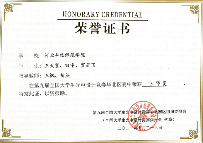 近日,由中国光学协会主办,燕山大学承办的第九届全国大学生光电设计竞赛(华北区赛)在燕山大学举行。来自北京、天津、河北、山西、内蒙古的31所高校的229支队伍共计1033名师生参赛。我校机电学院由3名学生组成的1个代表队参加了此次比赛,最后获得集体三等奖。(编辑:孙艳敏 审核:赵宗宝)
