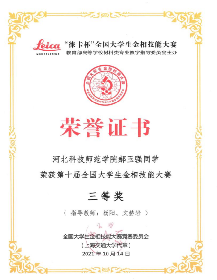 近日,由教育部高等学校材料类专业教学指导委员会主办、上海交通大学承办的2021年“徕卡杯”第十届全国大学生金相技能大赛在上海交通大学闵行校区举办。机电工程学院2019级机制专业郝玉强获得全国三等奖。