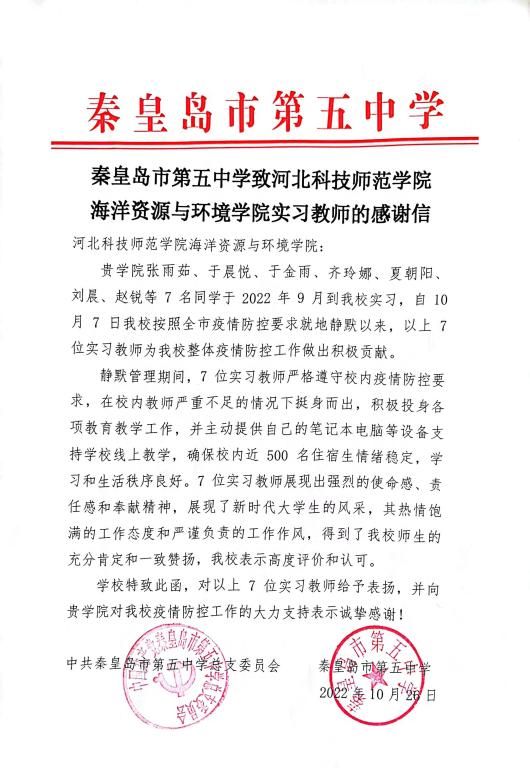 近日,秦皇岛市第五中学向我校发来感谢信,对海洋资源与环境学院张雨茹、于晨悦、于金雨、齐玲娜、夏朝阳、刘晨、赵锐等7名同学在教育实习期间为秦皇岛市第五中学整体疫情防控工作做出的积极贡献表示感谢,同时对我校给予秦皇岛市第五中学疫情防控工作的支持表示诚挚的谢意。