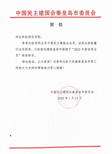 近日,中国民主建国会秦皇岛市委员会向我校发来贺信,感谢学校党委一直以来对民建市委工作的大力支持和帮助。我校中国民主建国会会员张明同志积极履职尽责,被民建市委授予 “2022年度优秀会员”荣誉称号。(编辑:孙艳敏 审核:赵宗宝)