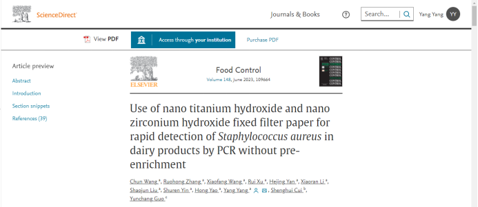 近日,我校食品科技学院杨洋教师团队在国际权威期刊食品控制(SCI,JCR Q1,中科院大类分区1区,顶刊,IF=6.652)发表论文“纳米氢氧化钛和纳米氢氧化锆固定滤纸无需前增菌快速检测乳制品中金黄色葡萄球菌方法的建立”。