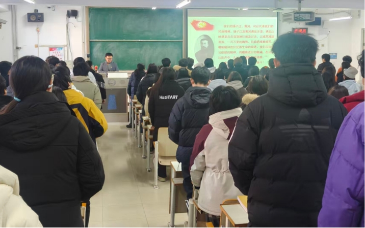 宣讲渐近尾声,全体参会人员起身站立,以铿锵有力的语调齐声诵读了李大钊先生的《艰难的国运与雄健的国民》,滚烫的热忱与奋进的力量随着朗朗诵声扑面而来,久久萦绕在会场之中。