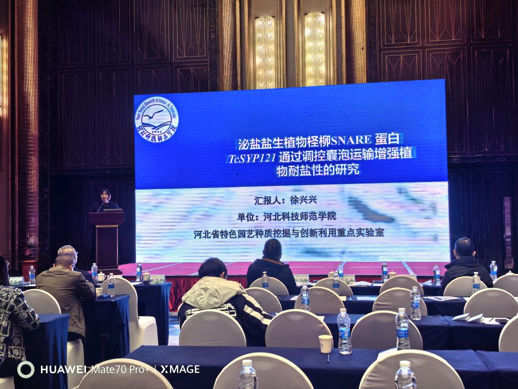 会议期间,团队成员徐兴兴在S5林木遗传育种分会场作了题为《泌盐盐生植物柽柳SNARE蛋白TcSYP121通过调控囊泡运输增强植物耐盐性的研究》的学术报告。报告深入解析了柽柳作为泌盐盐生植物的耐盐分子机制,揭示了关键蛋白在囊泡运输与抗逆生理中的调控网络。该研究成果引起了与会专家的广泛关注,现场就耐盐基因挖掘与林木分子育种技术进行了深入探讨,充分展示了团队在耐盐碱植物基础研究领域的最新进展。张国君院长带领团队重点与北京林业大学、西南林业大学、云南大学、河北农业大学等高校院所的专家进行了广泛而深入的交流,双方围绕柽柳、海棠等特色观赏林木的种质创新、良种选育及产业化推广等关键问题交换了意见,并就未来在人才培养、资源共享及跨区域科研项目申报等方面达成了初步合作共识。