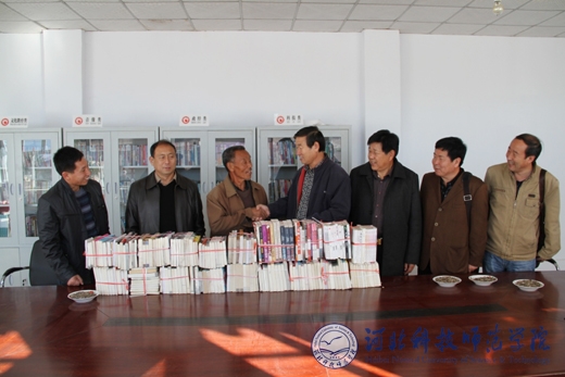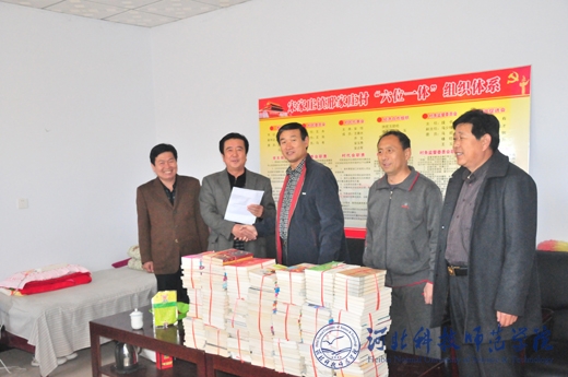 2013年10月14日,校长助理高书国、图书馆党总支书记赵友、馆长宋和平及图书馆相关部门同志到张家口市蔚县邢家庄村、南董庄村慰问我校驻村工作组,向帮扶村农民书屋捐赠图书。校党委常委、驻村工作组组长李佩国及相关镇、村领导出席了捐赠活动。