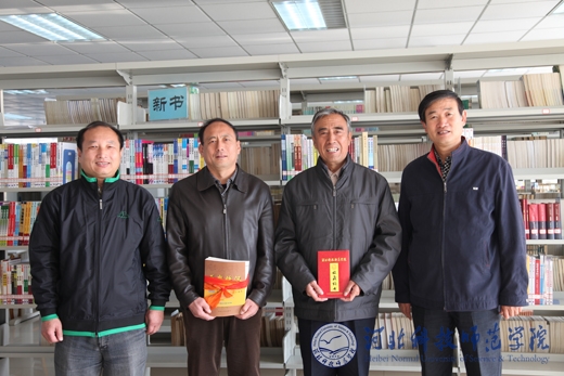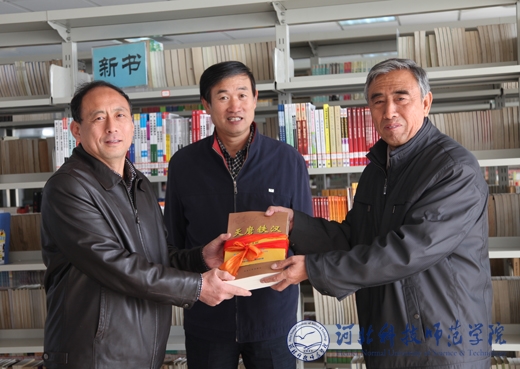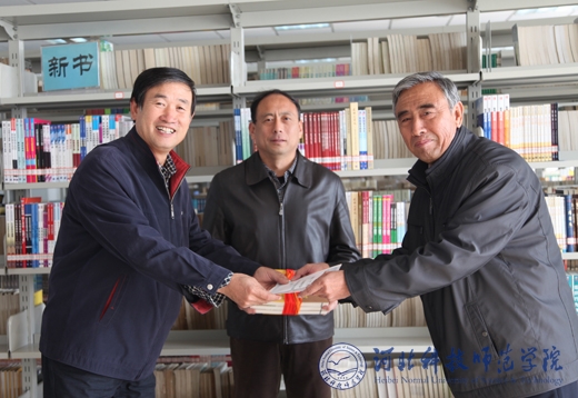 2013年10月18日,我校退休教师、原秦皇岛教育学院党委书记王凤翔在秦皇岛校区向学校图书馆捐赠自己历经五年时间撰写的专著《天磨铁汉》一书。图书馆党委书记赵友,图书馆馆长宋和平,离退休人员党总支书记、离退休人员管理办公室主任于洪奎参加了捐赠仪式。