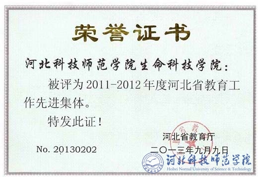 近日,经河北省教育厅组织评审,我校生命科技学院被评为2011-2012年度河北省教育工作先进集体,武士勋、陈攀峰两位同志被评为2011-2012年度河北省教育工作先进个人。(编辑:孙艳敏 审稿:田 毅)