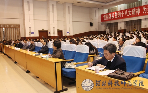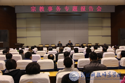 2013年10月17日,我校在秦皇岛校区举办宗教事务专题报告会。秦皇岛市民族宗教事务局副局长蒋世超在会上作了宗教事务专题报告。学校党委书记辛彦怀、党委副书记宋绍富、副校长张福喜出席会议并听取报告。学校各二级基层党委(党总支)书记、副书记,职能部门全体人员,思想政治理论教学部全体教师,各院(系、部)学工办主任、分团委书记、专职辅导员,秦皇岛校区学生会、大学生自律委员会、心理调研会、就业自我指导委员会全体成员,研究生等共400余人现场听取报告。报告会由党委组织部部长田毅主持。