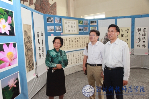 党委副书记、校长王同坤(右1)与副校长杨越冬和党委宣传部、统战部部长田毅欣赏书画作品