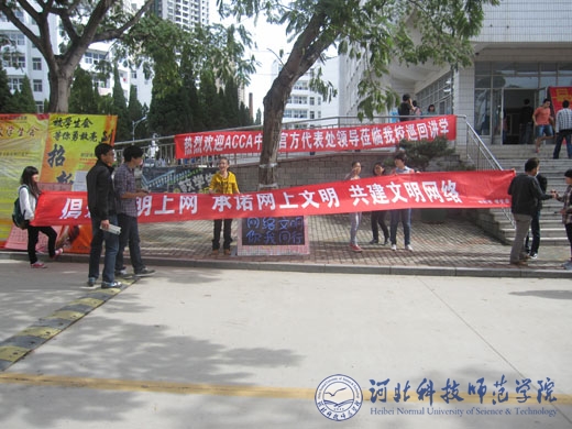 为响应国家互联网信息办公室“共守‘七条底线’”的号召,进一步规范大学生文明用网行为,营造健康向上网络环境,积极传播正能量,2013年9月,在校团委指导下,我校学生会在全校开展了以“倡导网络文明新风”为主题的网络文明宣传活动,精心组织了包括网络文明宣讲、条幅签名、倡议书、网络文明口号征集等活动。