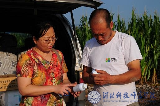 史秋梅教授向鸡场场长介绍我校研制的新药