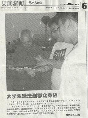 暑假期间,我校文法学院“律动港城”暑假社会实践小分队于7月14日至18日在秦皇岛市开展了“宣传法律知识,弘扬法制精神”社会实践活动。