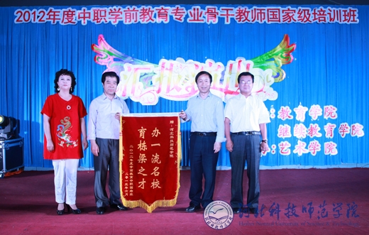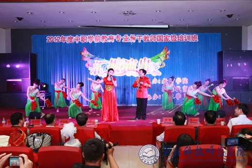 参加结业汇报演出的62名国培班学员来自湖北、安徽、新疆、青海、云南和西藏等22个省市自治区,包括白族、回族、汉族、蒙古族和哈萨克族等8个民族,他们以乐观、积极、向上的精神风貌向我校师生展示了他们的特长和培训成果,表达了依依惜别之情,赢得了现场师生的阵阵掌声。为表达感激之情,演出结束时国培班学员向我校赠送了锦旗。最后,出席演出活动的各级领导走上舞台同全体国培训班学员、演职人员合影留念。(编辑:孙艳敏 审稿:田毅)