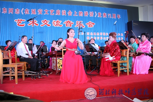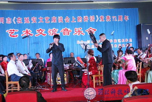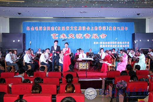 2013年5月23日,由我校艺术学院和秦皇岛市群艺馆联合举办的“纪念毛泽东同志《在延安文艺座谈会上的讲话》发表71周年艺术交流音乐会”在开发区校区隆重举行。校党委书记辛彦怀,党委副书记、校长王同坤出席活动并观看演出。校党委宣传部、教务处等部门主要负责同志以及艺术学院师生参加了音乐会并一起欣赏了节目表演。