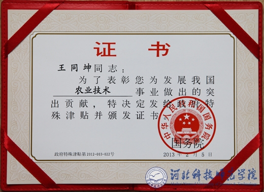 王同坤教授获得国务院政府特殊津贴专家荣誉称号