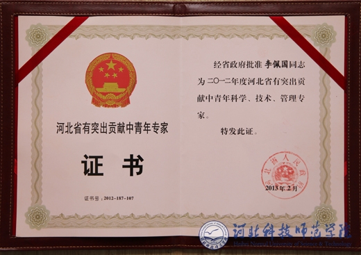 李佩国教授获得2012年度河北省有突出贡献中青年科学、技术、管理专家荣誉称号