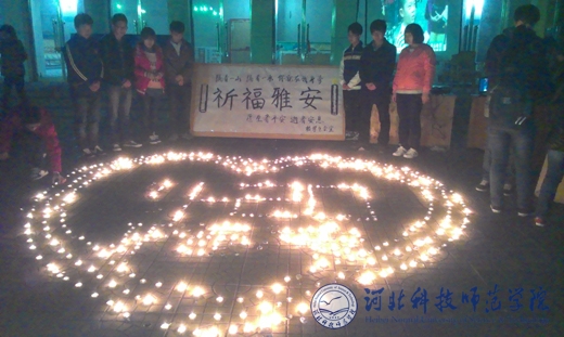 2013年4月20日8时2分,四川省雅安市芦山县发生了7.0级地震,造成了严重的伤亡。22日晚,校团委、学生会同时在秦皇岛、开发区、昌黎三个校区开展了祈福雅安活动。用自己特有的方式表达了对逝者的哀思和对灾区的牵挂。