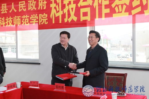 2013年4月13日,我校与抚宁县人民政府科技合作签约仪式在抚宁县驻操营镇大道岭村举行。出席签约仪式的有我校校长王同坤教授、副校长杨越冬教授、科研处副处长闫立英教授、动物科技学院书记段立华、机电工程学院院长刘荣昌教授、工商管理学院院长刘恩峰教授、食品科技学院副院长康维民教授、生命科技学院副院长乔亚科教授、园艺科技学院副院长齐永顺教授,抚宁县县长石兆旭、县委副书记刘红军、县委常委副县长武建光、副县长王东军,县政府相关职能部门负责人及重点乡镇和种、养殖大户代表等。签约仪式由抚宁县县委副书记刘红军主持。抚宁县县长石兆旭与我校校长王同坤分别代表双方共同签署了《抚宁县人民政府与KYTY.COM开云科技合作协议书》。
