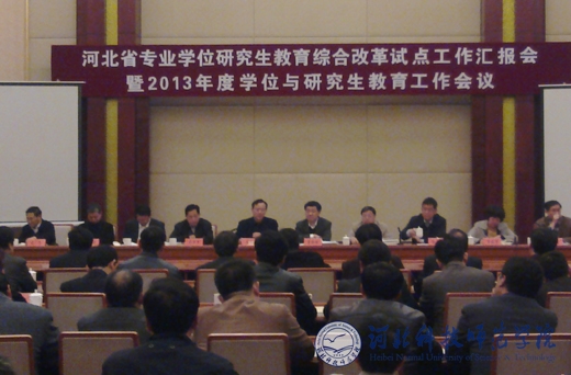 2013年3月27日,河北省专业学位研究生教育综合改革试点汇报会暨2013年度学位与研究生教育工作会议在石家庄召开。来自全省25个研究生培养单位的近120名代表参加了会议。我校副校长杨越冬,研究生部副主任于凤鸣及学科学位办工作人员出席了会议。会议由河北省人民政府学位委员会办公室荣飞主任主持。