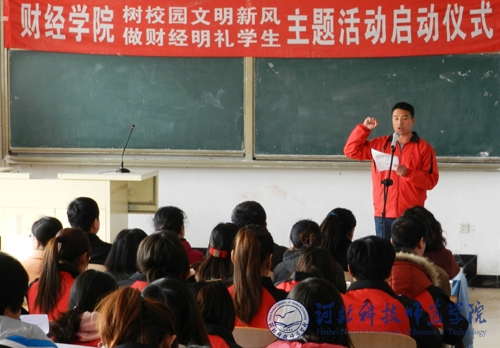 为了提高学生的课堂文明、宿舍文明和日常文明水平,促进文明行为养成,2013年3月28日下午,财经学院在秦皇岛校区举行“树校园文明新风,做财经明礼学生”主题活动启动仪式。学院党委书记张建宗、院长贾圣武出席启动仪式。学院学生党支部成员、全体辅导员、班主任、学生党员及主要学生干部共200余人参加了启动仪式。 启动仪上,与会学生党员、学生干部签署了《财经学院“树校园文明新风,做财经明礼学生”承诺书》,并通过全体投票方式,选出“做文明大学生,我们为自己代言”作为本次活动的口号。 张建宗书记在讲话中号召全体学生党员、学生干部在活动中带好头,为同学做出表率;希望全体学生行动起来,提高做明礼学生的主动性、自觉性,经常自我反省,加强实践锻炼;要求学生党支部成员、辅导员、班主任将此项活动认真抓好、抓实、抓出成效。