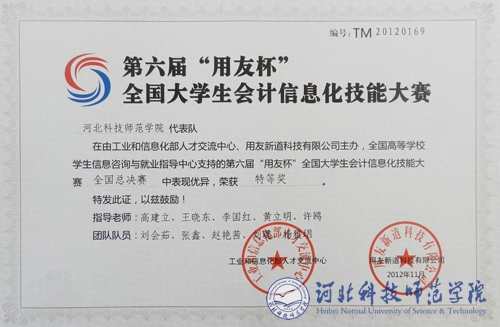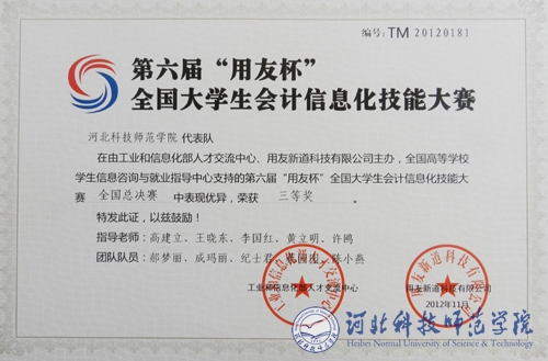 近日,由工业和信息化部信息中心和用友新道科技有限公司主办的“第六届全国大学生会计信息化技能大赛”结果揭晓,我校的两支代表队在全国903支代表队中脱颖而出,分别获得全国总决赛特等奖和三等奖。