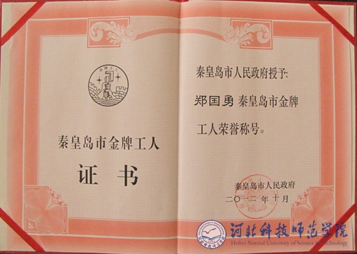 近日,我校职工郑国勇获第三届“秦皇岛市金牌工人”称号,受到秦皇岛市人民政府表彰。(编辑:孙艳敏 审稿:赵建平)
