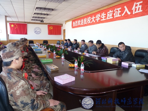 2012年12月9日上午,我校在秦皇岛校区召开了2012年在校大学生新兵(男兵)入伍欢送会。副校长、武装部政委孟令臣及党委宣传部部长、统战部部长田毅,招生就业处处长张福喜,党委学工部部长、学生处处长冯瑞银,教务处处长武士勋,武装部部长、保卫处处长吴子国,校长办公室副主任赵彦军出席了会议。会议由武装部部长、保卫处处长吴子国主持。