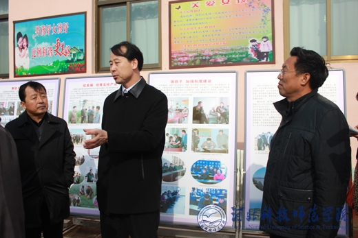 河北省委组织部副部长王亮(中)与校党委副书记王同坤(右一)、卢龙县委书记孙国胜(左一)研究驻村工作
