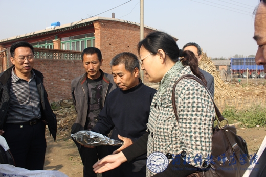 图为园艺科技学院项殿芳、边卫东两位教授向果农介绍设施葡萄下一步的管理要点