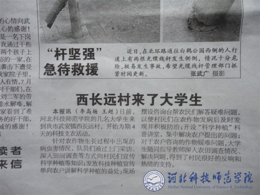 近日,生命科技学院暑期社会实践活动三个小分队先后被秦皇岛新闻电视台等市、县级等新闻媒体报道。报道介绍了生命科技学院学生社会实践活动情况,对生命科技学院社会实践活动取得的成果给予充分肯定。(编辑:孙艳敏 审稿:赵建平) (相关链接:http://v.youku.com/v_show/id_XNDMyNDExNzYw.html从10)