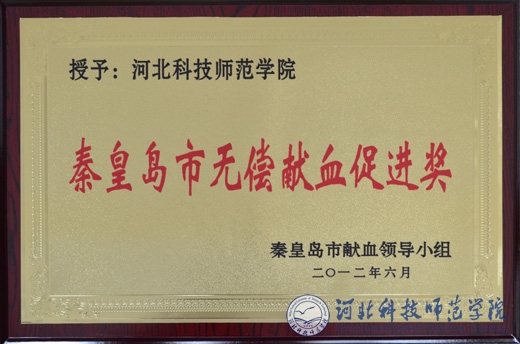我校获得的“秦皇岛市无偿献血促进奖”荣誉奖牌