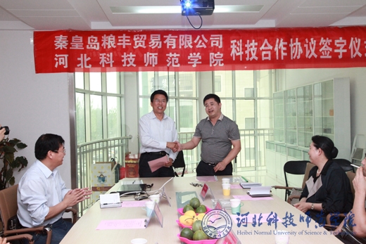 2012年5月22日上午,我校与秦皇岛粮丰贸易有限公司签署了科技合作协议。秦皇岛市农工委常务副书记陈宝奎,秦皇岛市农业局副局长郭凤田,秦皇岛市科技局副局长韩瑞凤、农业科科长陈燕,秦皇岛粮丰贸易有限公司董事长缴宝丰,我校党委副书记王同坤、科研处处长杨越冬、生命科技学院院长宋士清以及田景文研究员和吉志新副教授等出席了会议。