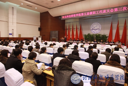 2012年3月17日上午8:20,我校五届三次教代会在雄壮的国歌声中隆重开幕。校党委副书记王同坤主持大会,全体与会代表参加了会议。辛彦怀校长向大会作了题为《求真务实,锐意进取,努力开创学校改革发展新局面》的工作报告。财务处处长于红军向大会作了财务工作报告。