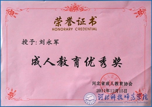 近日,中国成人教育协会对在成人教育理论研究和实践发展方面做出突出贡献的单位和个人进行了表彰。经省教育厅与河北省成人教育协会推荐、中国成人教育协会评审,我校继续教育学院赵宝柱院长被授予“全国成人教育贡献奖”。同时,赵宝柱和刘永军两位同志还分获河北省成人教育协会颁发的“河北省成人教育贡献奖”、“河北省成人教育优秀奖”荣誉称号。(编辑:孙艳敏 审稿:赵建平)