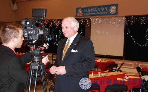 特洛伊大学校长霍金斯博士在晚会上接受特洛伊电视台采访