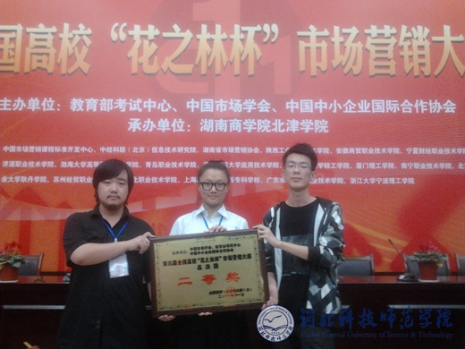 2011年11月3日至4日,第四届全国高校市场营销大赛总决赛在湖南商学院北津学院举行。本次大赛由教育部考试中心、中国市场学会、中国中小企业国际合作协会主办,共有近千所本科高校、高职高专院校的2000多支代表队参赛。在卢锡慧教授指导下,我校欧美学院商务管理系2009级市场营销本科专业学生刘萌潜、金宏宇及2009级工程管理本科专业王乔三人组成的代表队完成作品《移动新闻管家鹿泉地区销售计划》营销案例参加了大赛的软件对抗赛、文案讲述、答辩、小组赛、终极PK等比赛程序,最终取得了总决赛二等奖的优异成绩。
