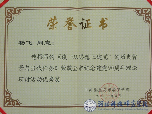 日前,市委召开了庆祝中国共产党成立90周年理论研讨会,回顾总结我们党成立90年来的光辉历程和宝贵经验,交流党史党建理论研究成果。市委副书记杨泰安在会上指出,我们对建党90周年最好的纪念,就是牢记使命,薪火相传,真心实意把秦皇岛的事情办好,一切为了人民,一切依靠人民,一切发展成果由人民共享。市委常委、宣传部部长时晓峰主持会议并宣布评奖结果。此次活动最终评定获奖论文40篇。我校的2篇论文分别获奖,其中离退办党总支推荐的王凤翔老师《注重抓好文化民生不断推进社会建设》获三等奖、思想政治理论教学部党总支推荐的杨飞老师《谈“从思想上建党”的历史背景与当代任务》获优秀奖。市人大常委会副主任蔡运国,市政协副主席闻德生出席会议并为获奖者颁奖。