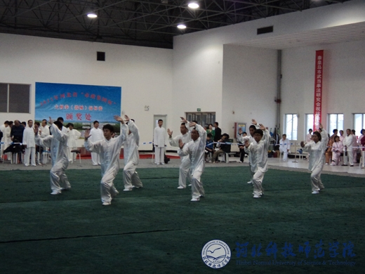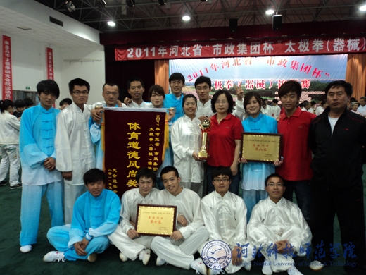 2011年5月5日至8日,河北省“市政集团杯”太极拳锦标赛在秦皇岛市举行。我校派出两支代表队参加了个人单项和集体项目的比赛。经过剧烈的角逐,体育系许鹏展获得男子青年组42式太极剑金牌、42式太极拳银牌、陈式传统太极拳二等奖,张丽获得女子42式太极拳金牌、传统太极刀一等奖、陈式传统太极拳三等奖。集体项目分别获得第七名和第八名,并获团体总分第七名。同时,许鹏展、张丽两位同学及我校代表队被大会授予“体育道德风尚奖”。