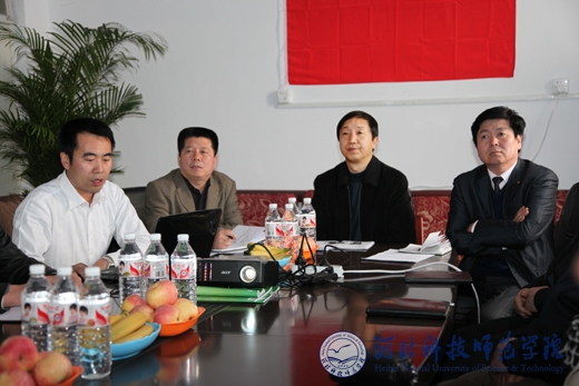 辛彦怀校长首先来到理化学院,听取了学院主要负责同志关于学院整体办学情况的工作汇报。他对理化学院的一级硕士点建设、学生考研、SCI论文发表等方面取得的成绩给予了充分肯定,就我校理化学院的学科建设、师资队伍建设、课程改革、院企合作、学生实习实训基地建设、公共实验平台建设以及未来发展规划等与理化学院负责同志进行了深入探讨与交流。辛校长强调,理化学院一要充分发挥基础实力雄厚的优势,进一步解放思想,在明确办学方向,凝炼办学理念的基础上,充分研讨论证重点学科的发展方向,调整并确定好学科建设的准确定位;二要基础研究上水平,应用研究增效益,充分发挥理论研究的引领作用和应用研究的支撑作用,把理论研究的成果转化到应用领域中去,切实走出一条产、学、研相结合的发展之路。
