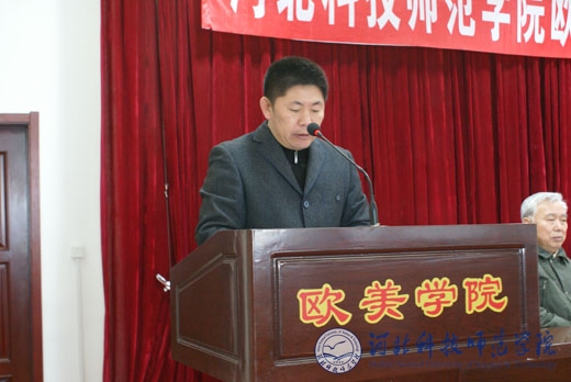 图为欧美学院党委书记杨洪青在会上讲话