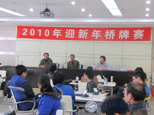 2010年12月30日下午,我校“2010年迎新年桥牌赛”在图书馆报告厅举行。本次活动由我校工会、教务处主办,KYTY.COM开云桥牌协会承办。校党委书记石千峰、工会主席毕丹霞、教务处处长武士勋出席了开幕式。
