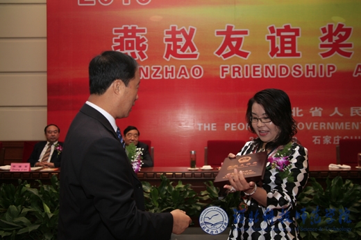 会上,副省长宋恩华向包括侯漫在内的11名外国专家颁发了“燕赵友谊奖”。“燕赵友谊奖”是河北省政府设立的外国专家最高奖项,这是我校继2007年美籍专家莎娜•夏特勒获得“燕赵友谊奖”后第二次获此殊荣,是省政府以及有关上级部门对我校国际合作和引智工作的又一次肯定。