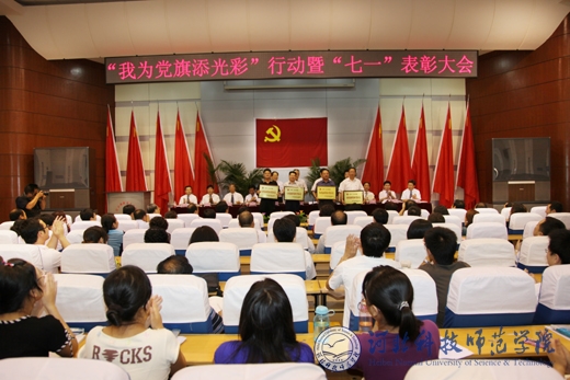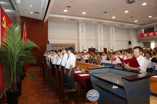 大会表彰了我校一年来涌现出的先进基层党组织、优秀共产党员和优秀党务工作者,与会全体党员重温了入党誓词。大会隆重启动了“我为党旗添光彩”行动,并向全校基层党组织和广大党员发出了号召,号召全校基层党组织和广大党员积极投身到此项活动中来。基层党组织和个人代表在大会上作了发言。