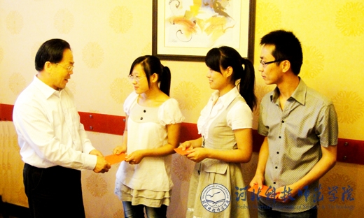 图为孟令臣副校长为志愿者颁发奖金