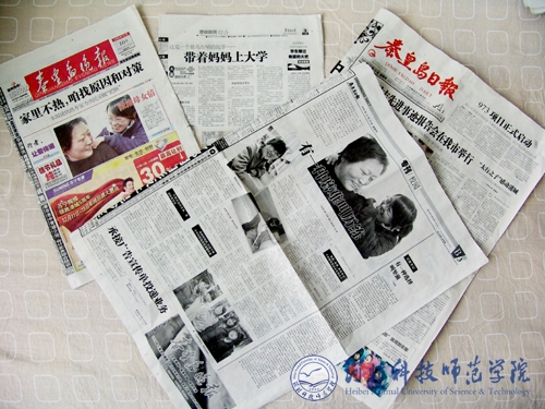 2009年12月,《秦皇岛日报》、《秦皇岛晚报》、秦皇岛电视台等媒体对我校动物科技学院一年级曹焱同学带着生病的母亲上大学的事迹进行了实地采访和报道。请全校师生点击以下网址浏览。