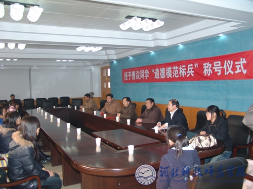 2009年12月7日,我校在昌黎校区举行授予曹焱同学“道德模范标兵”荣誉称号暨颁奖仪式。副校长孟令臣,昌黎校区办公室主任刘卫东,学生处处长田毅、副处长马爱林,动物科技学院院长吴建华、副院长杨宗泽以及部分师生代表参加了授奖仪式。仪式由吴建华院长主持。