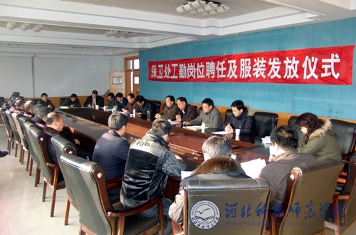 2009年12月9日下午,我校保卫处工勤岗位聘任及服装发放仪式在昌黎校区举行。副校长孟令臣,保卫处处长胡志杰,后勤服务总公司总经理姜亚东、副总经理于明来,保卫处副处长陈建新、高玉峰及相关工作人员参加了仪式。仪式由陈建新副处长主持。