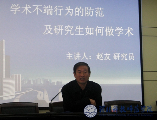 2009年11月24日上午,研究生部邀请校学报编辑部主任赵友研究员,在图书馆九楼学术报告厅举办了题为“学术不端行为的防范及研究生如何做学术”的学术报告,研究生部师生70余人听取了报告。