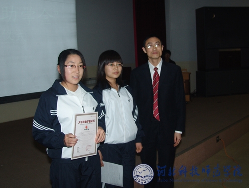 2009年11月28日晚7:00,我校动物科学系在昌黎校区学术报告厅举行首届“大北农助学金”颁发仪式。北京科高大北农饲料有限责任公司华北公司人事部经理李自明先生和事业部经理张雪梅女士,校团委书记李艳坡,动物科学系总支副书记、副主任宋金昌,副主任杨宗泽等相关部门领导和老师以及动物科学系部分学生出席了颁奖仪式。