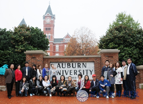 图为我校赴美文化交流团全体成员在美国奥本大学校门口留影