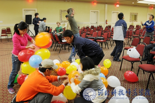 图为留美学生和美国朋友在帮助布置会场